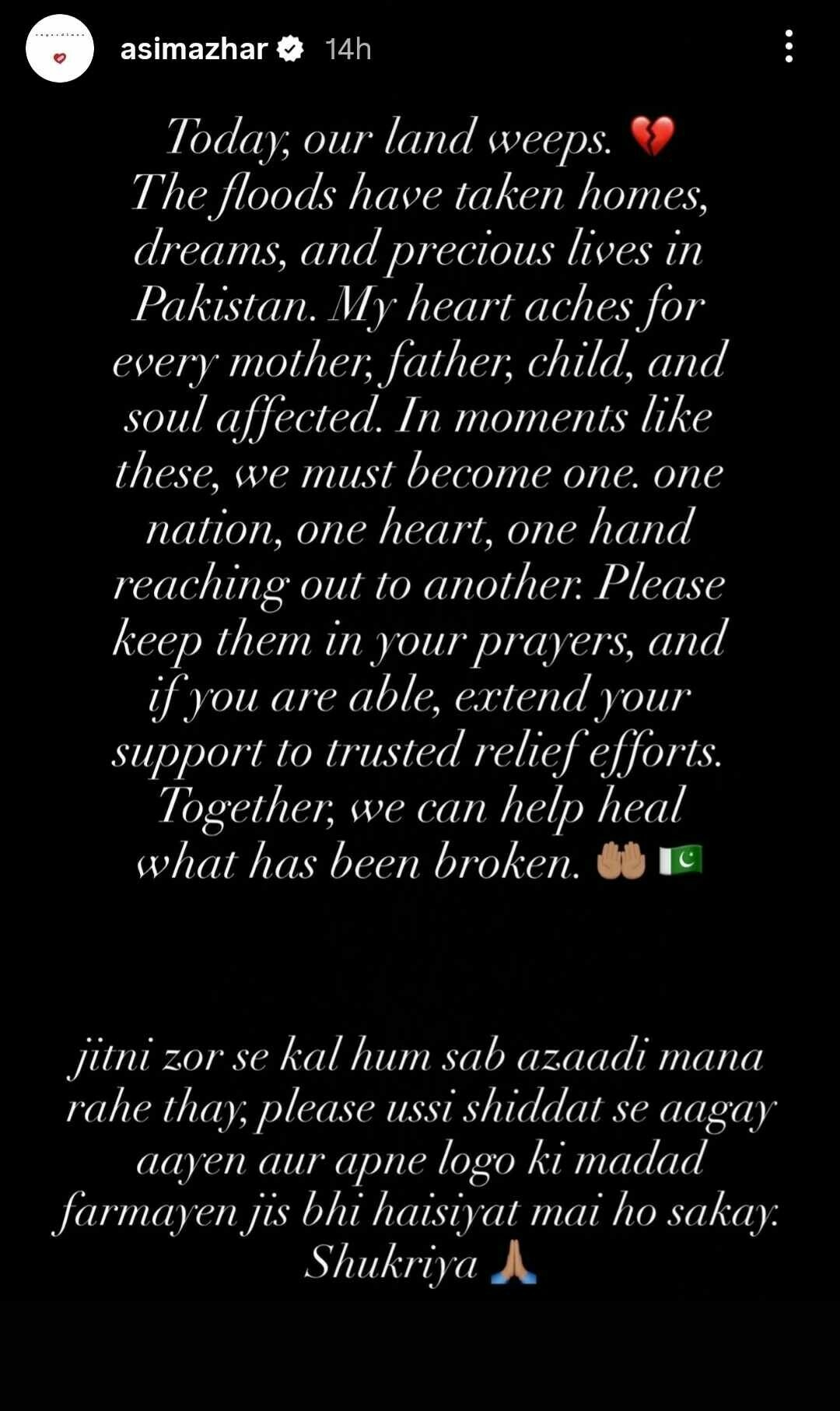 Singer Asim Azhar wrote, “Today, our land weeps. The floods have taken homes, dreams, and precious lives in Pakistan. My heart aches for every mother, father, child, and soul affected.”