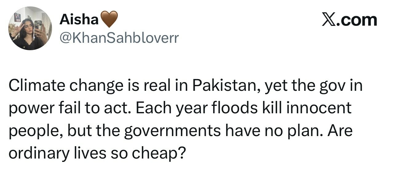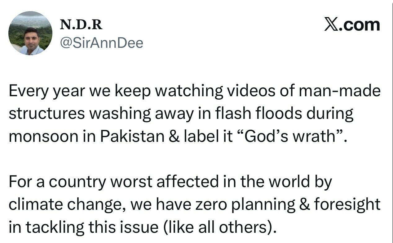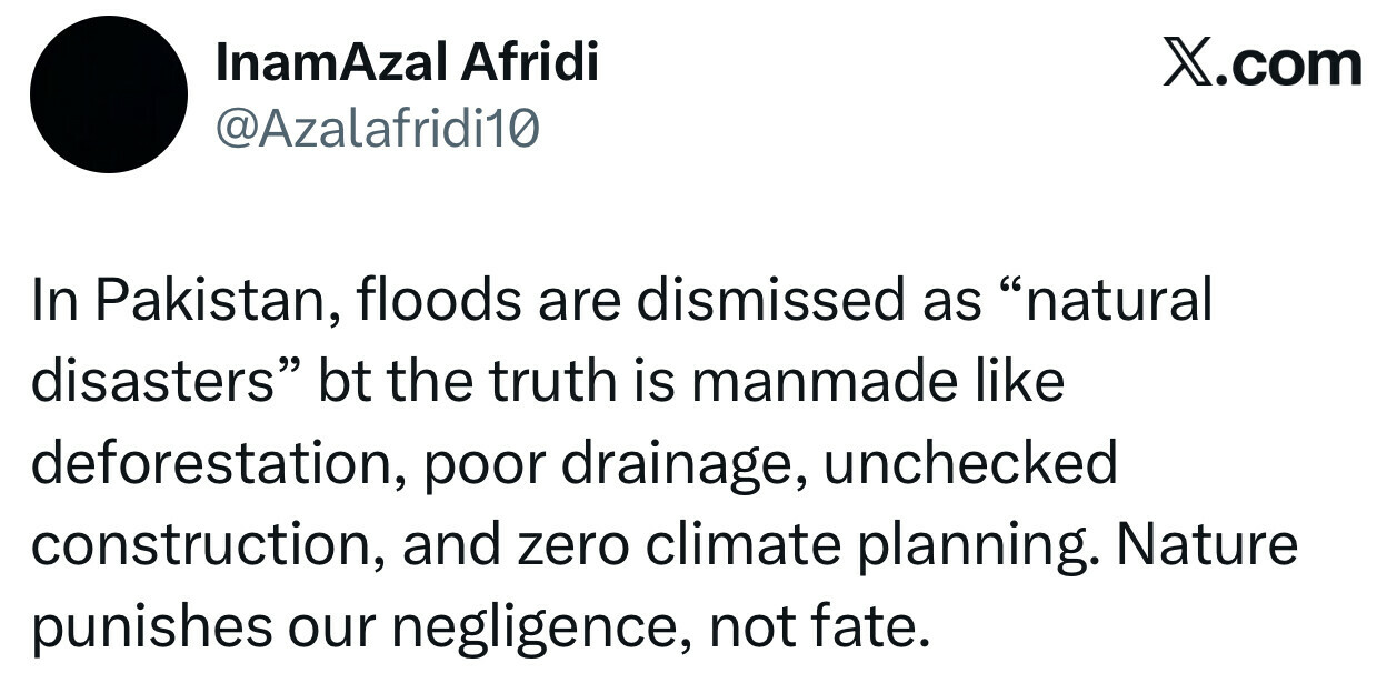 One user pointed out, “In Pakistan, floods are dismissed as ‘natural disasters’ but the truth is manmade — deforestation, poor drainage, unchecked construction, and zero climate planning. Nature punishes our negligence, not fate.”