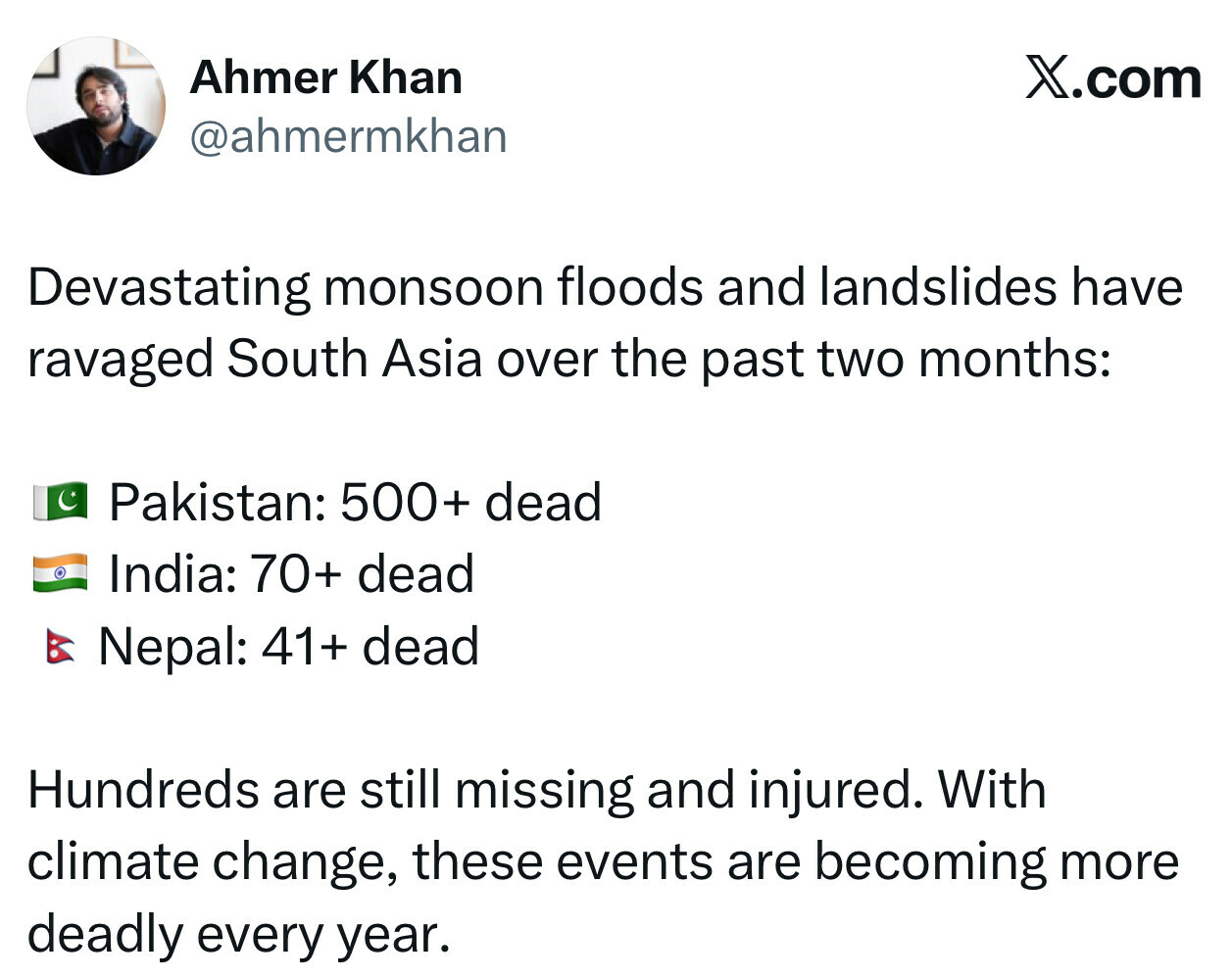 The heartbreak of these floods is undeniable — hundreds of families broken overnight, and towns submerged. But as the floodwaters rise each monsoon, so does the frustration of citizens who know that climate change is not an abstract threat. It is here, it is deadly, and it is being met with little more than thoughts and prayers.