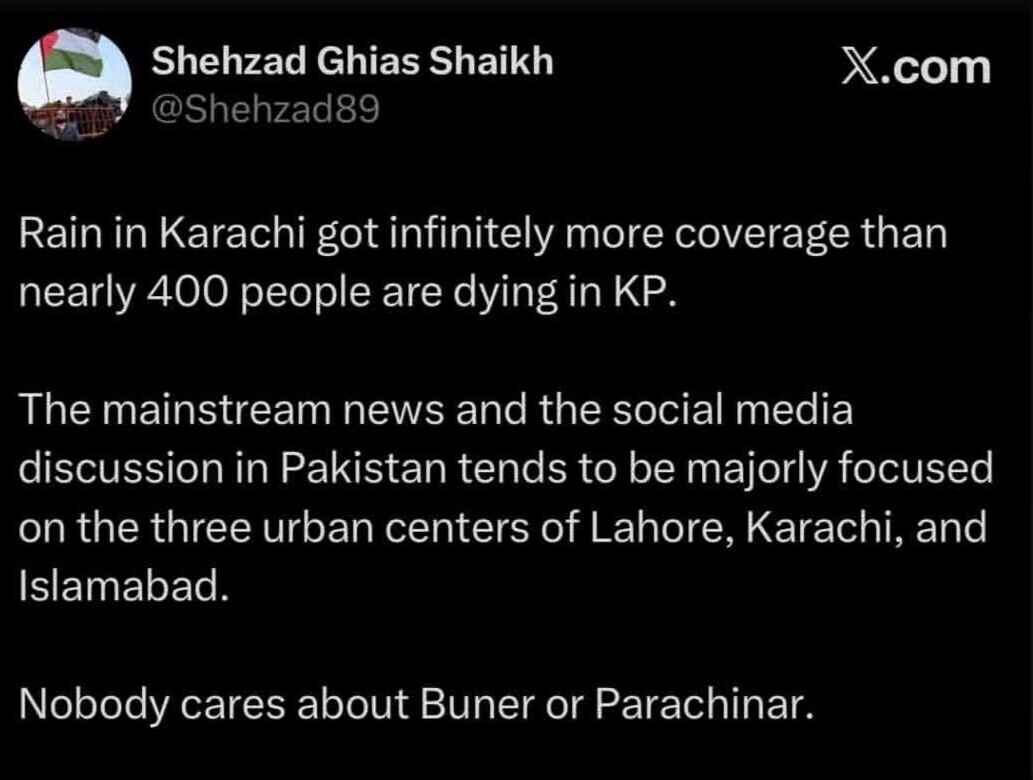 Users also highlighted the plight of those most affected by this year’s monsoons. The flood victims in Khyber Pakhtunkhwa, Gilgit-Baltistan and Azad Jammu and Kashmir were on people’s minds, including podcast host Shehzad Ghias Sheikh, who said their tragedy deserves to be seen too.