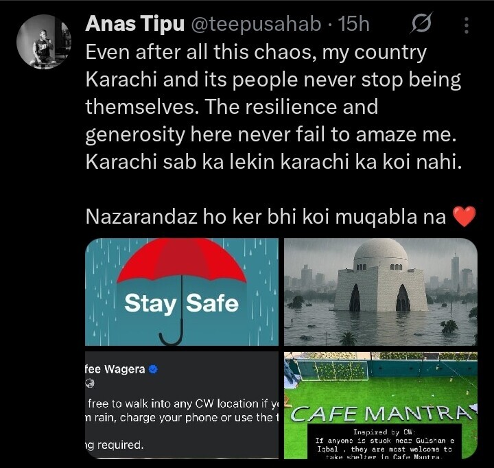 Karachiites, coming to each other’s aid, opened their homes and offices to those stranded in various parts of the city. Neighbourhood WhatsApp groups coordinated to ensure people got home safely, and many businesses invited people inside to shelter from the rain and charge their phones.