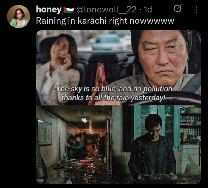 A user posted shots from the movie Parasite to highlight how rain and urban flooding impact social classes differently, a contrast that holds especially true in Karachi.