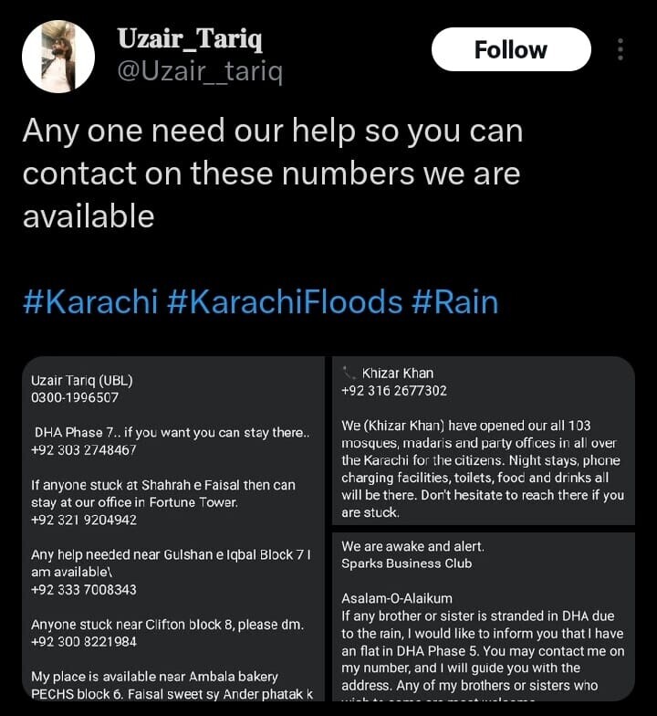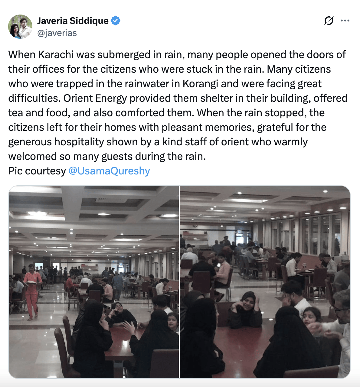 Eateries like Cafe Mantra in Gulshan, Jani Biryani in Clifton, Da Noi in DHA and Kolachi at Ocean Tower opened their doors to let people take refuge from the downpour. Coffee Wagera, a chain of coffee shops, opened up all its branches across Karachi to people who needed a place to hide from the rain. The home goods store Habitt also kept both of its branches open for people to shelter in.