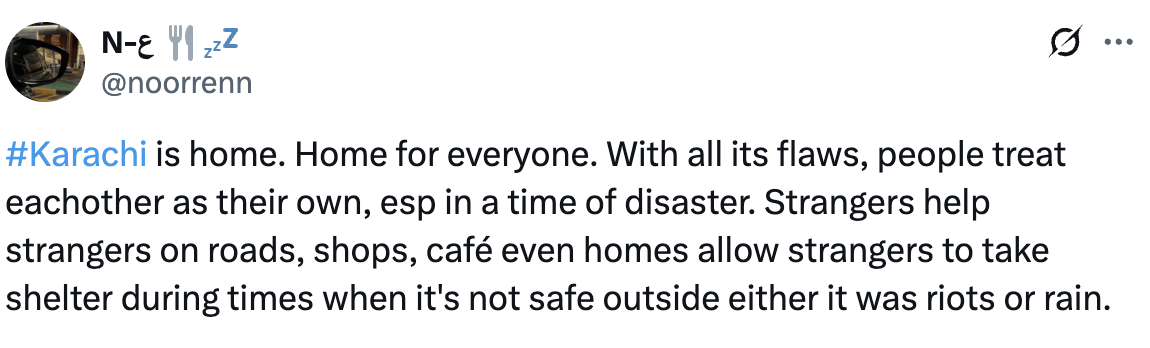 Karachiites, however, had each other’s backs, even when authorities didn’t. People opened up their homes to passersby, cafés offered hot drinks and phone charging facilities to people waiting for the roads to clear, neighbours offered to coordinate movements to ensure nobody got stuck alone, and people pushed cars, hauled bikes and helped each other out.