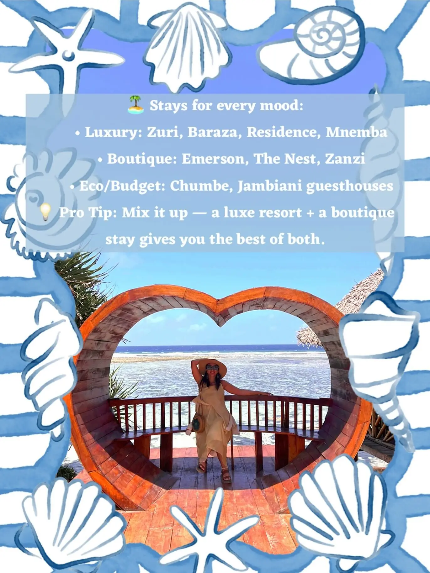 For a luxurious stay, she suggested Zuri, Baraza, The Residence, and a private island lodge in Mnemba. For Boutique stays, she listed Emerson Hotels, The Nest Boutique Resort, and Zanzi Resort. And for eco-friendly, economical options, she recommended the Chumbe Island Coral Park and Jambiani guesthouses.