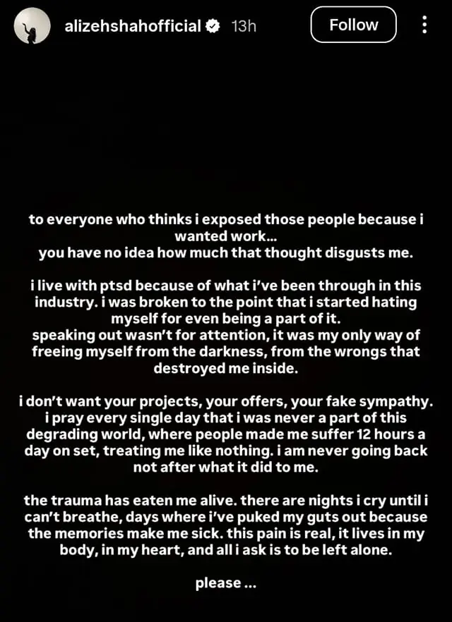 Shah said she doesn’t want offers or sympathy — she just wants space. “I don’t want your projects, your offers, your fake sympathy. I pray every single day that I was never a part of this degrading world, where people made me suffer 12 hours a day on set, treating me like nothing. I am never going back, not after what it did to me.”