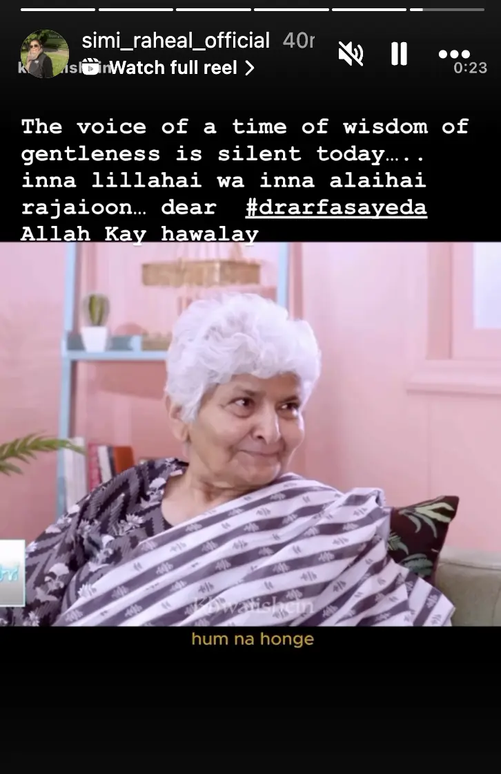 Actor Ayesha Omar thanked her for the “treasures she left behind,” while model and actor Kiran Malik shared a story mourning her loss.