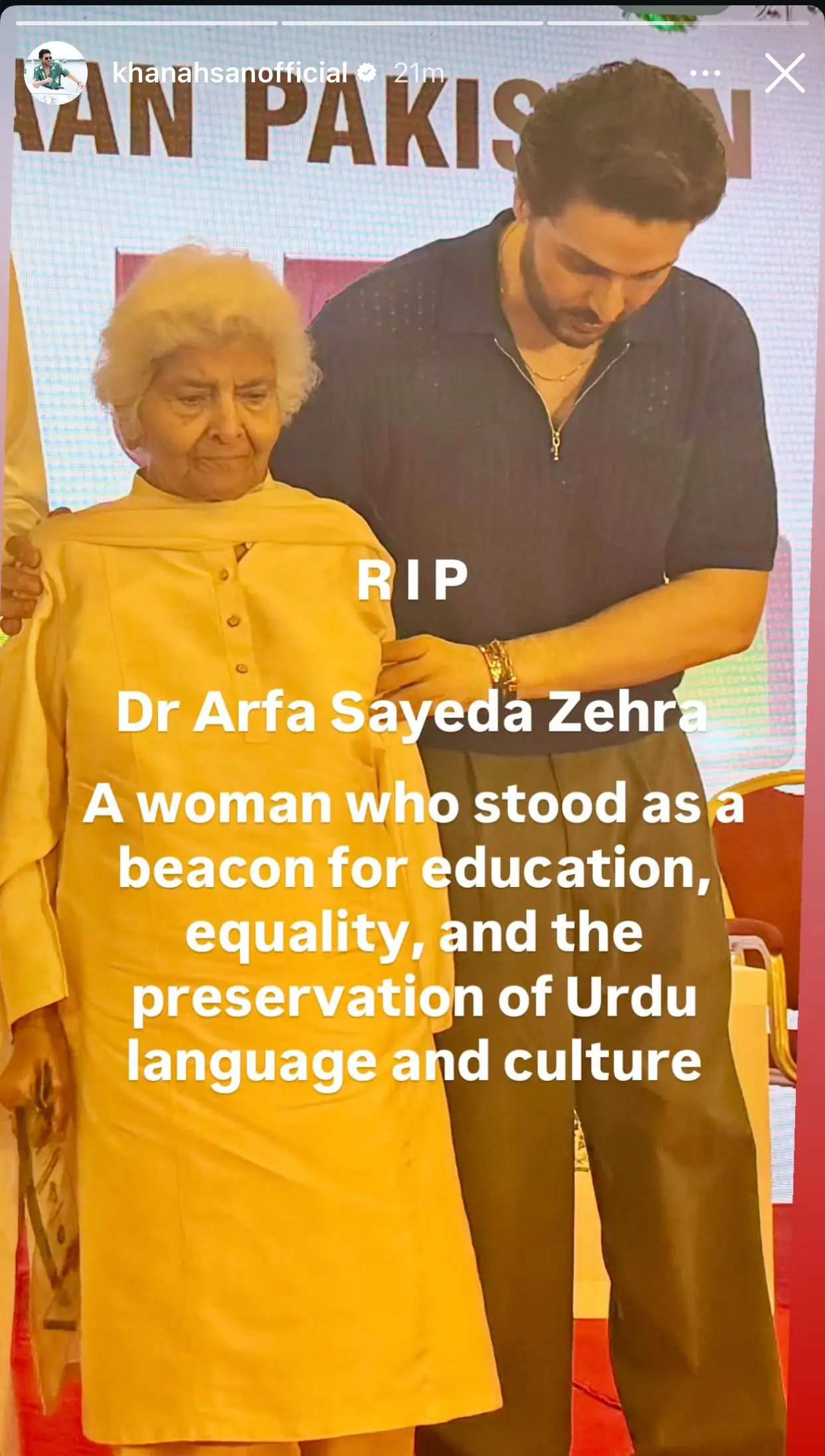 Actor Ahsan Khan described her as “a beacon for education, equality, and the preservation of Urdu language and culture,” while actor Hira Mani wrote that Dr Arfa’s words “will always keep her alive.”