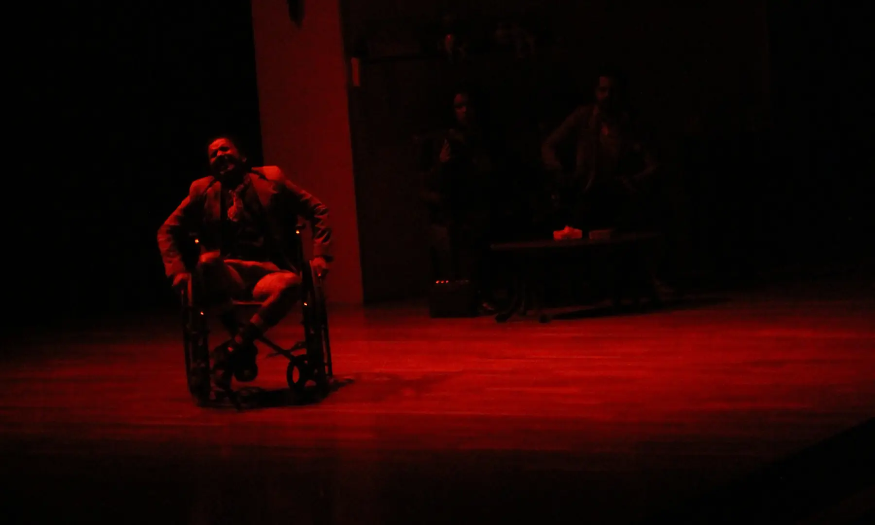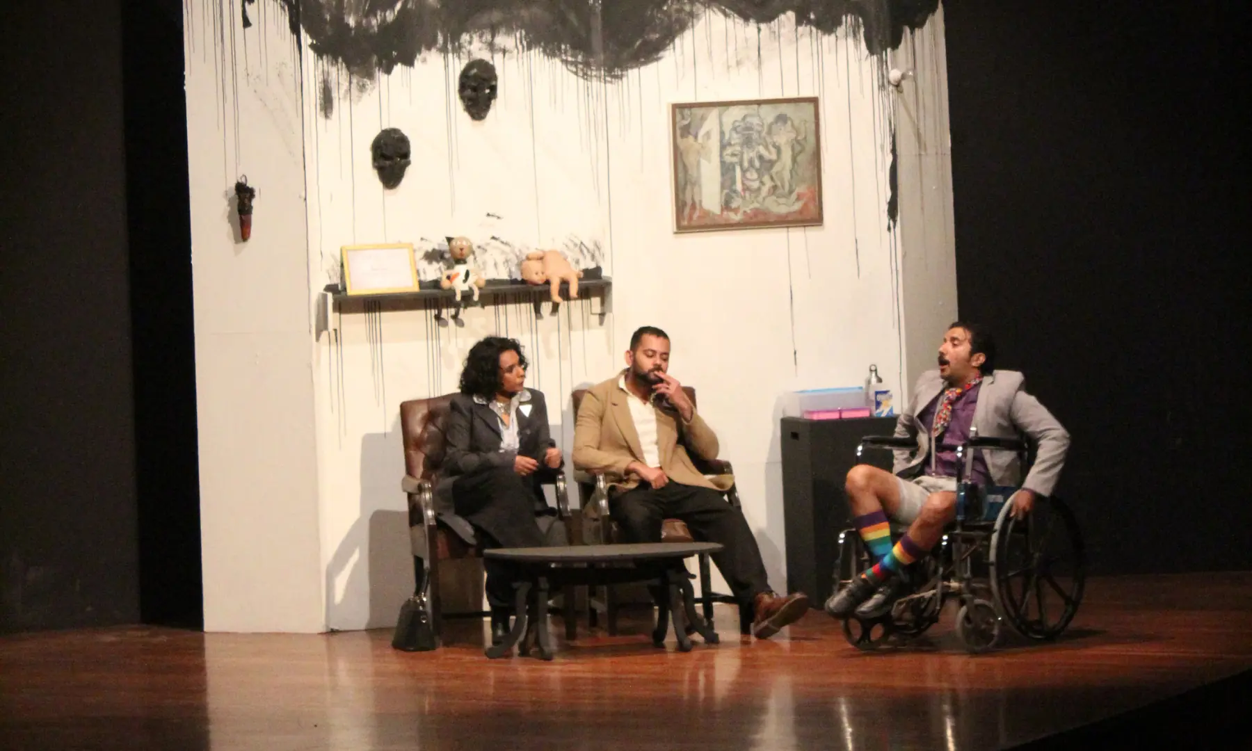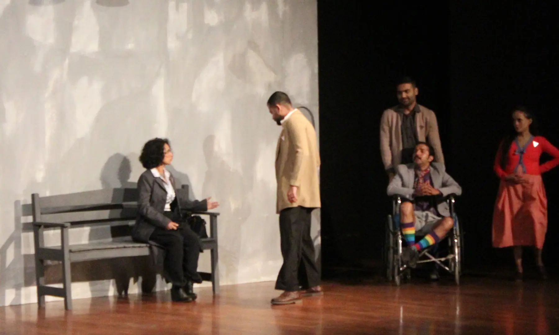 “All these sounds and movements are making me more anxious. Will you please stop it?” Maria tells Asher as their mundane bickering continues in the waiting area. The exchange is interrupted when the doctor, played by Ghouri, enters in a wheelchair. He is accompanied by two unnamed characters (Kainat and Rasool), a couple who have successfully conceived and now serve as a quiet contrast to Maria and Asher’s uncertainty. The doctor’s arrival shifts the mood of the scene: unpredictable and uncanny, he’s easily one of the play’s most striking presences.