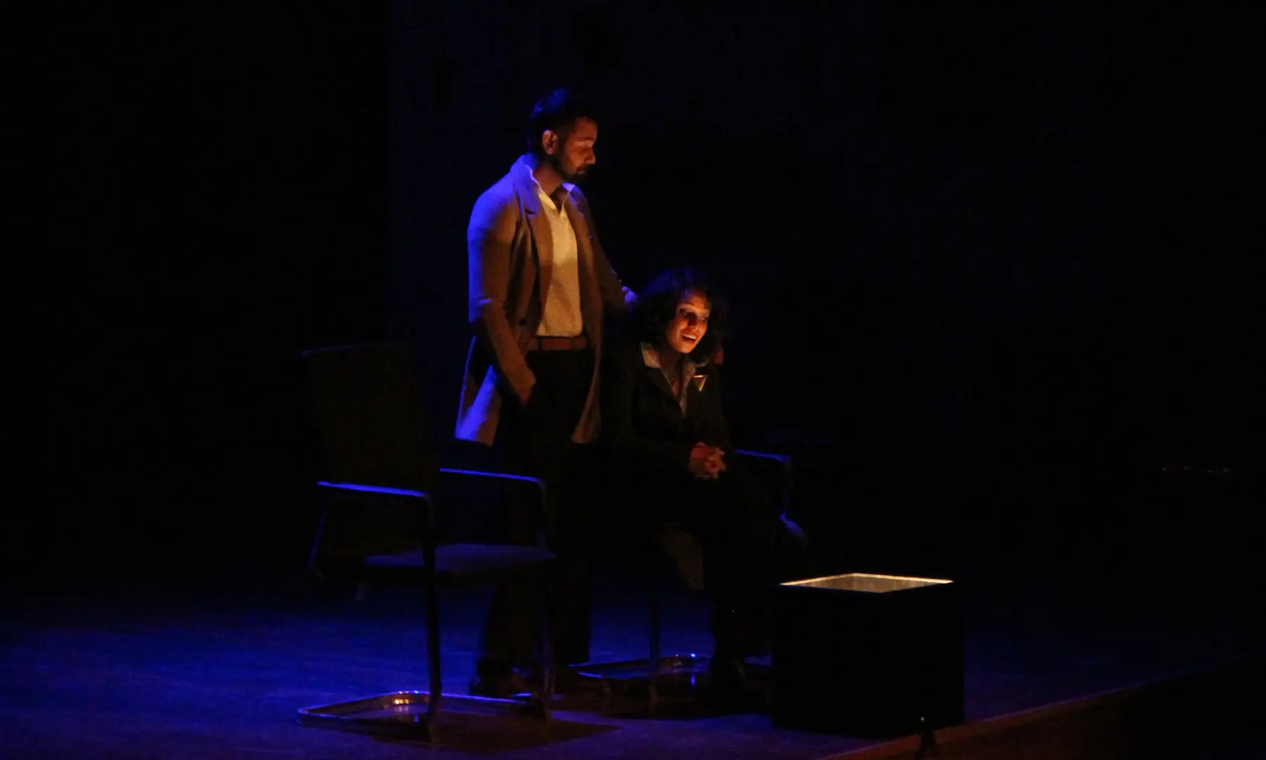With the tension built up, the lights now dim to a deep blue, and the audience brims with anticipation as the story shifts to its final scene (which Ahmed later described to me as the play’s “magnum opus”). Here, Asher and Maria confront the voice of a possible future child, embodied by a ‘box’ (voiced by Akber), who asks, almost painfully, “Are you guys good people?”