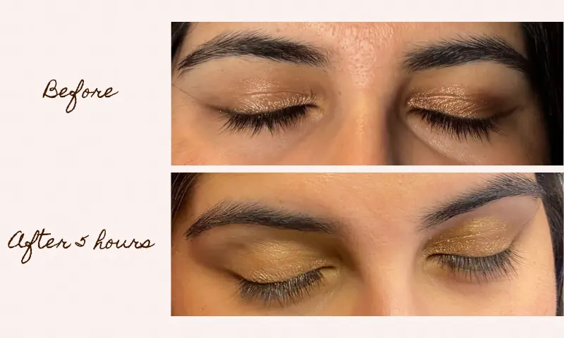 I applied the Champagne shade on my eyes, and honestly, beyond being a very pretty colour, it wore surprisingly well. I didn’t apply it over a base or a concealer, though, and I do think that would have made a difference. After about five to six hours, it started smudging slightly; a layer of concealer underneath would likely help keep it intact for longer wear.