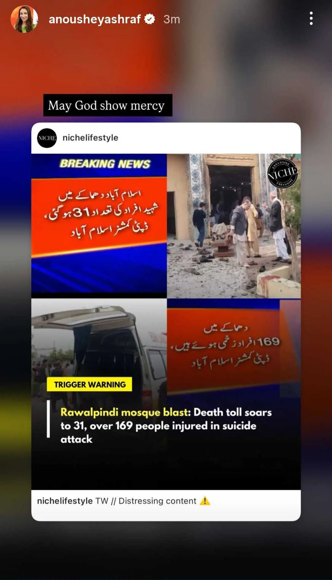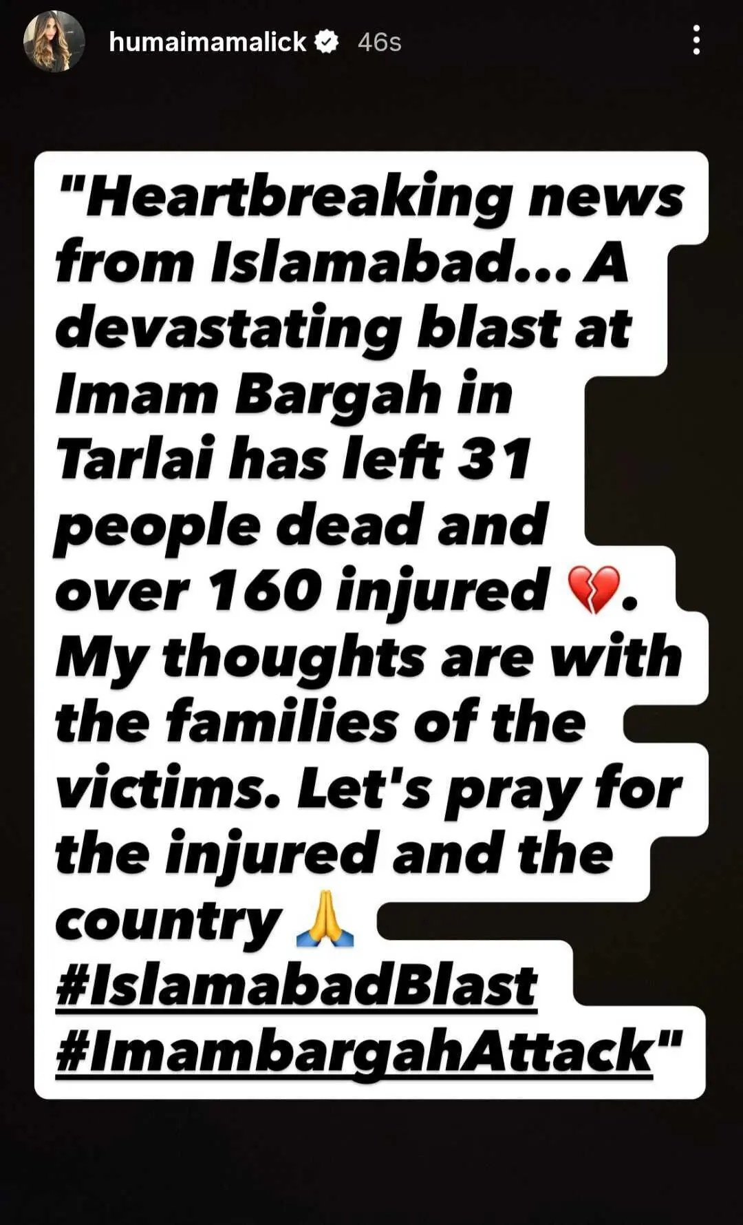 Actor Humaima Malik also posted a story on Instagram saying her thoughts were with those who had lost their loved ones. She asked for everyone to pray for the wounded and for Pakistan.