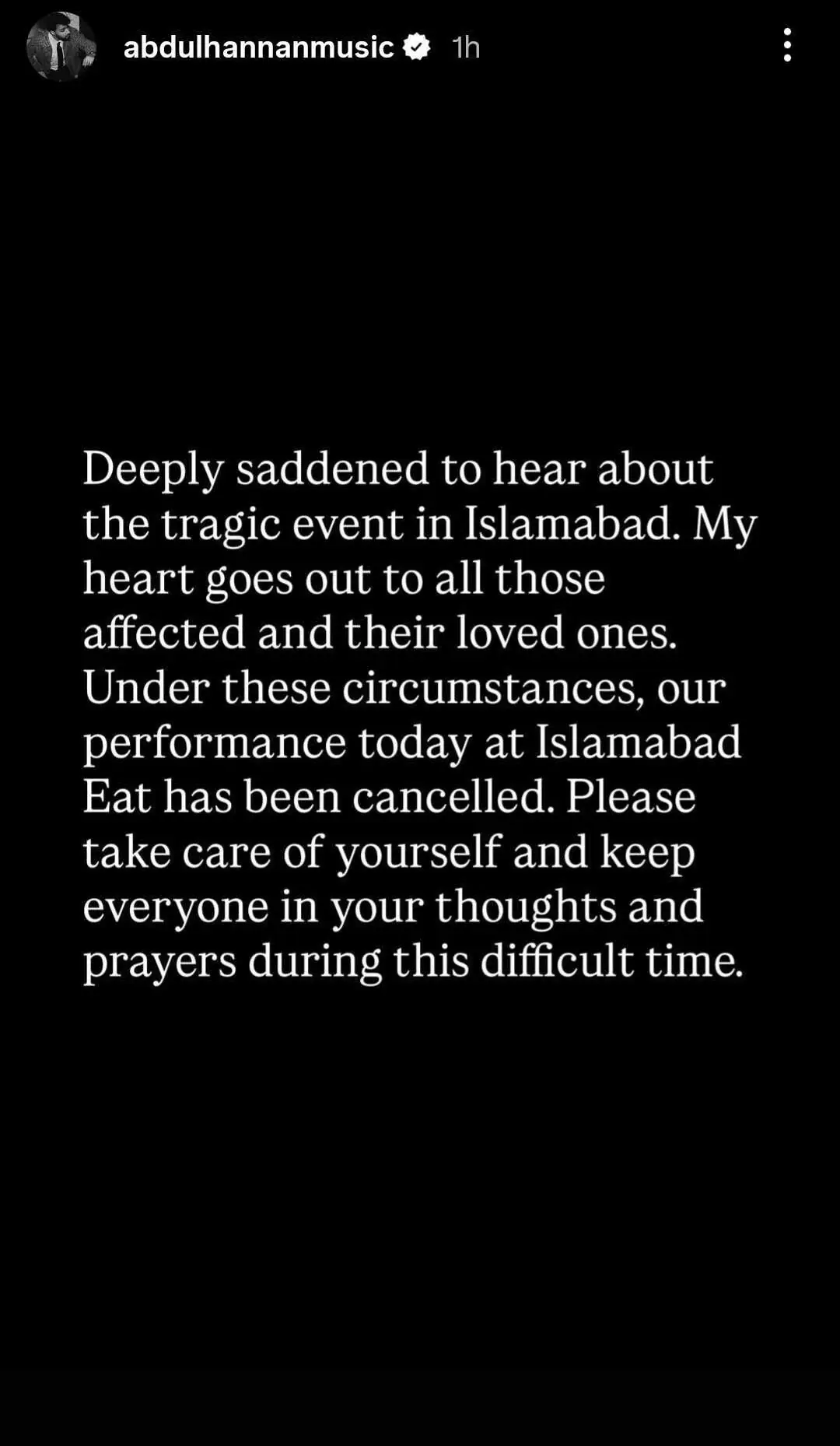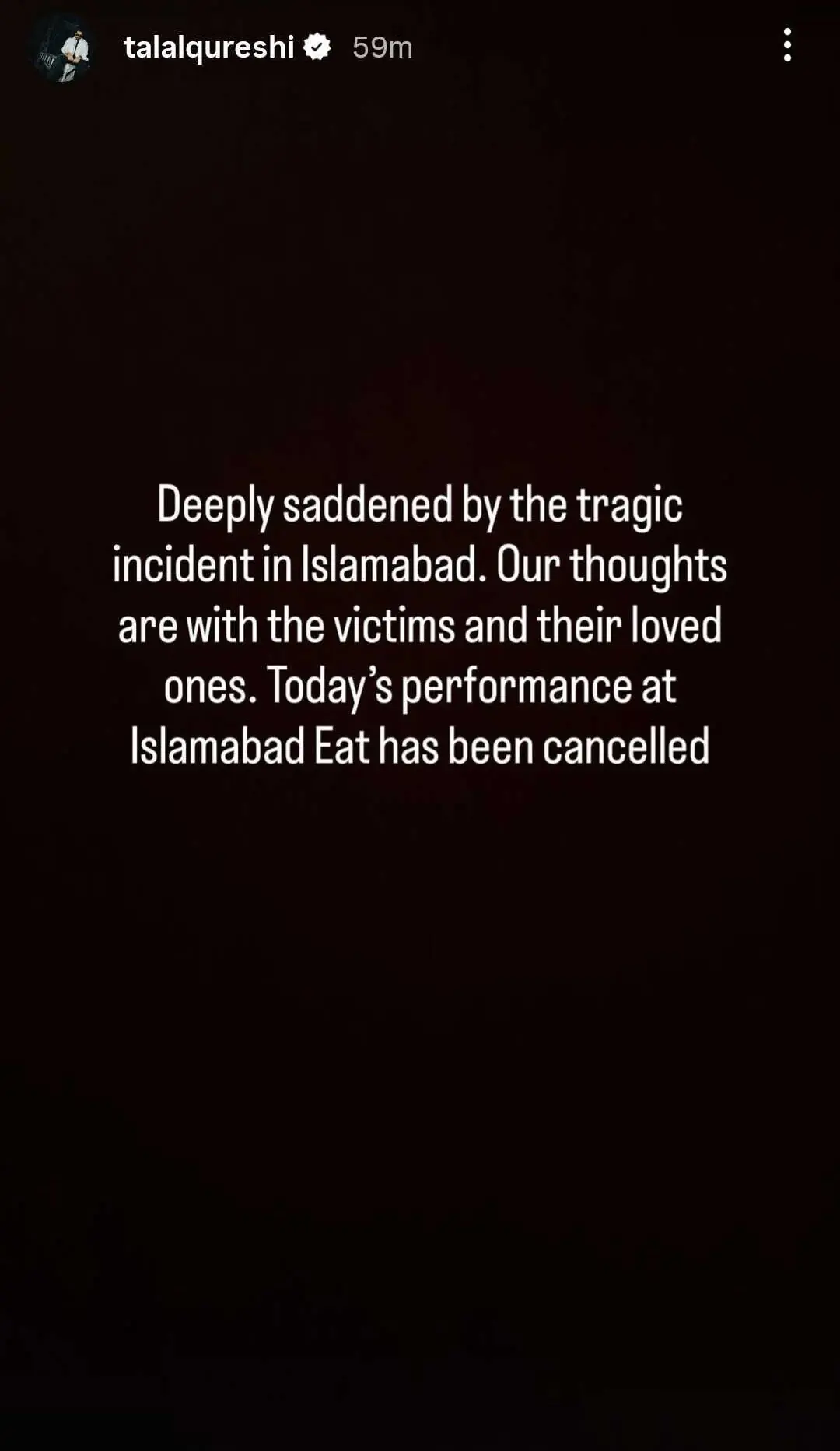 Musicians Talal Qureshi and Abdul Hannan said their performances at Islamabad Eat scheduled for later in the day had been cancelled in solidarity with the victims. Both said they were deeply saddened by the tragedy and the victims remained in their thoughts.
