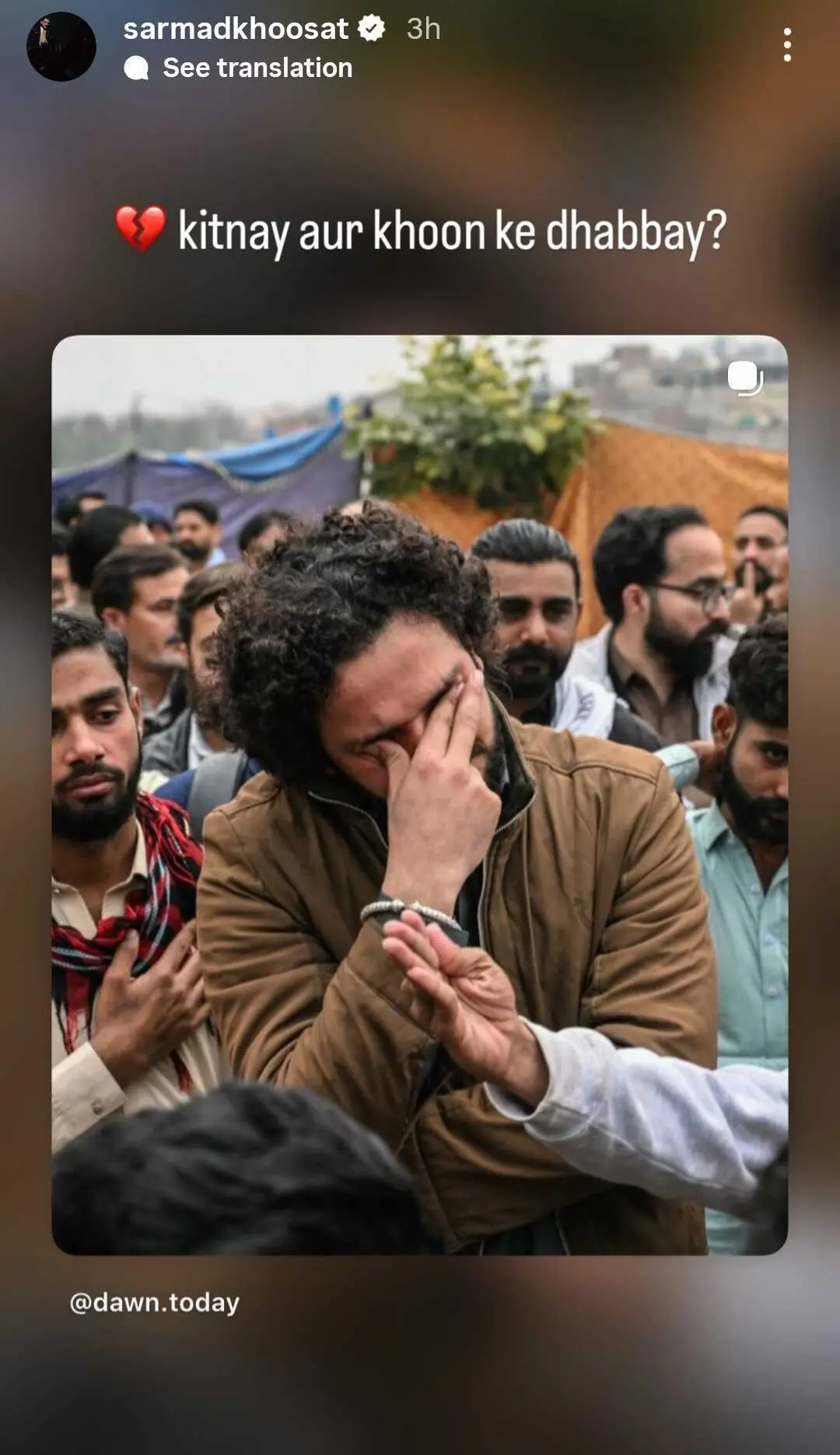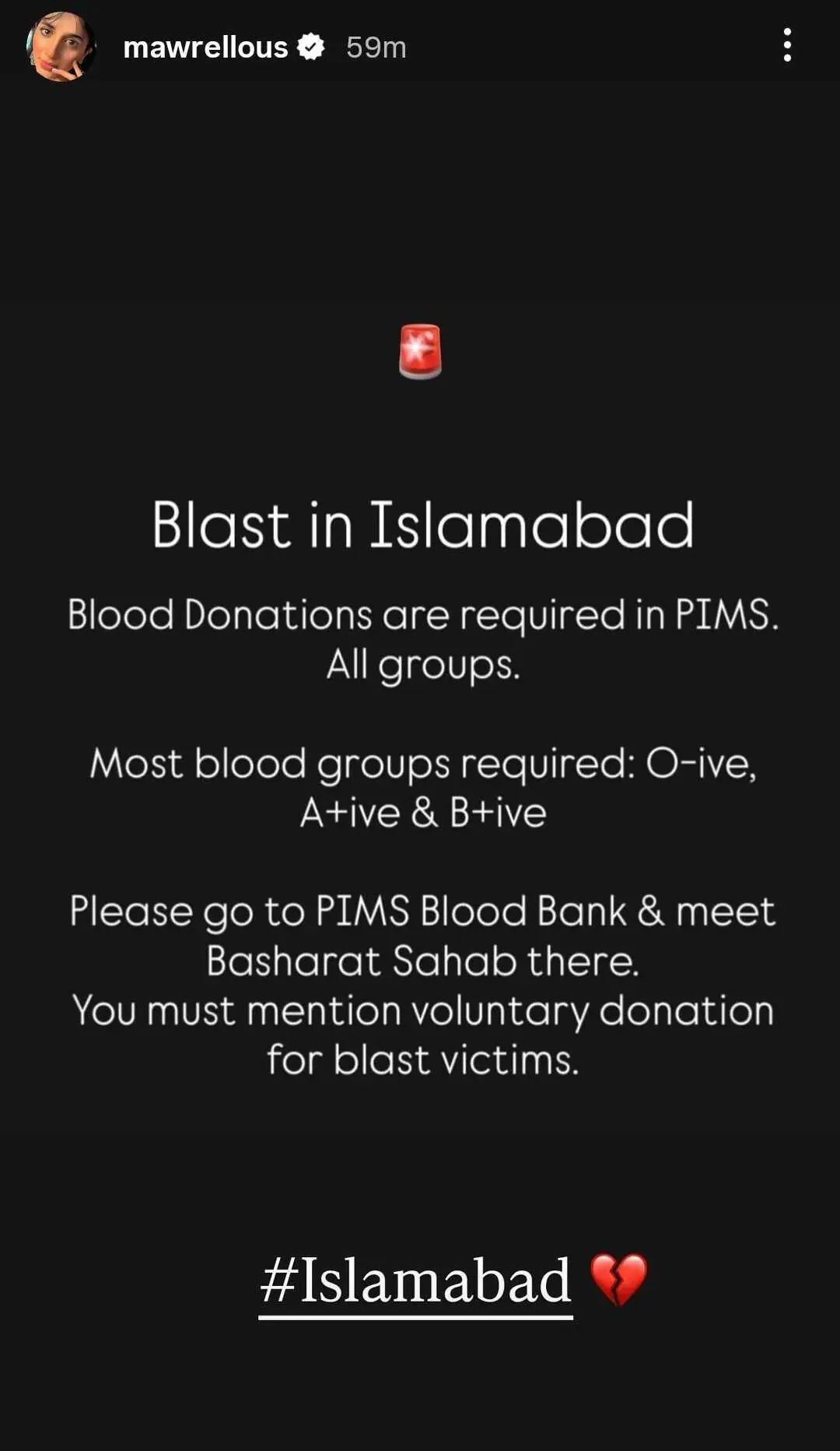 Scenes of chaos emerged at Islamabad’s Pakistan Institute of Medical Sciences, which was overwhelmed with a deluge of casualties and weeping loved ones. Actor Mawra Hocane and comedian Ali Gul Pir posted appeals for people in the city to donate blood.