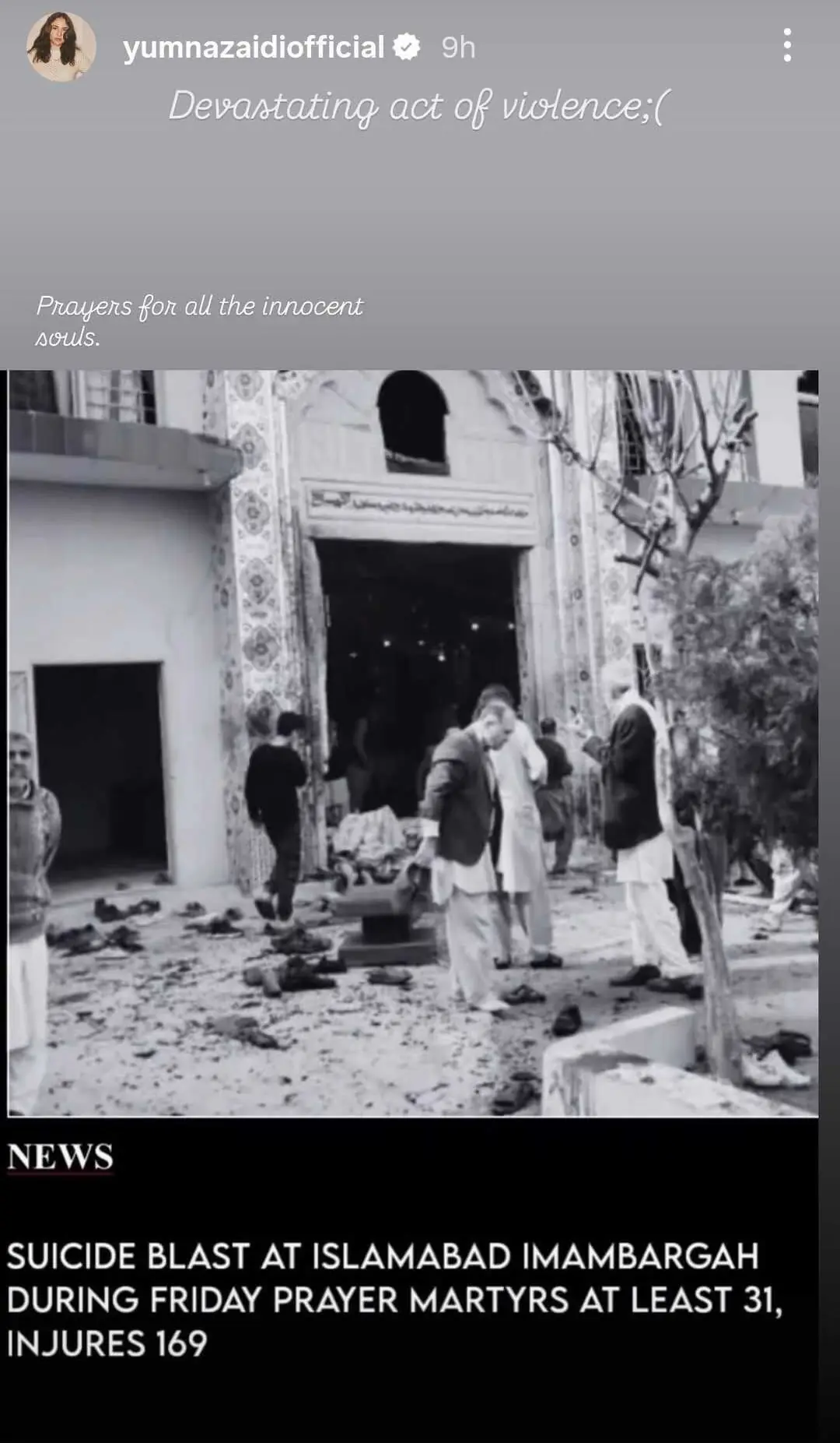 Outpourings of grief and prayers for victims of the deadly attack at the Imambargah Khadijah al-Kubra in Islamabad’s Tarlai area during Friday prayers continued to flood social media on Saturday, with many celebrities expressing their shock and horror online. The death toll from the incident has risen to 36, with over 100 others injured.