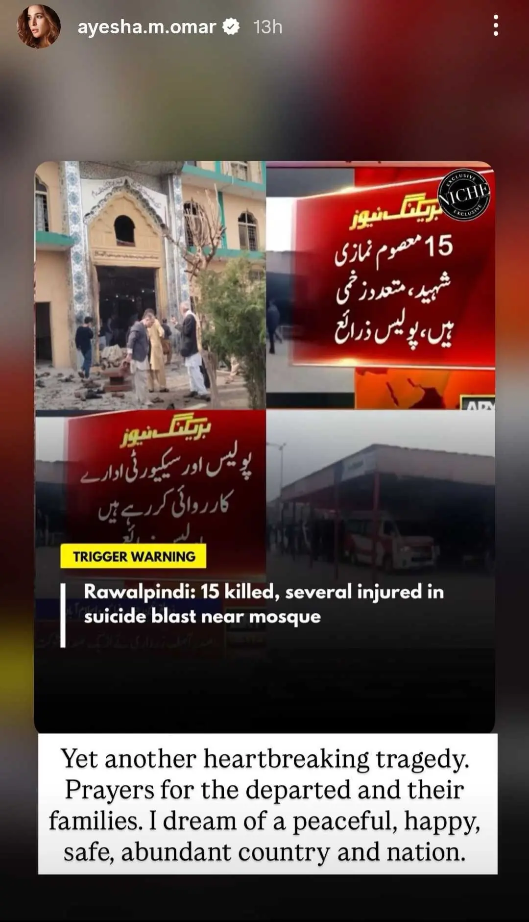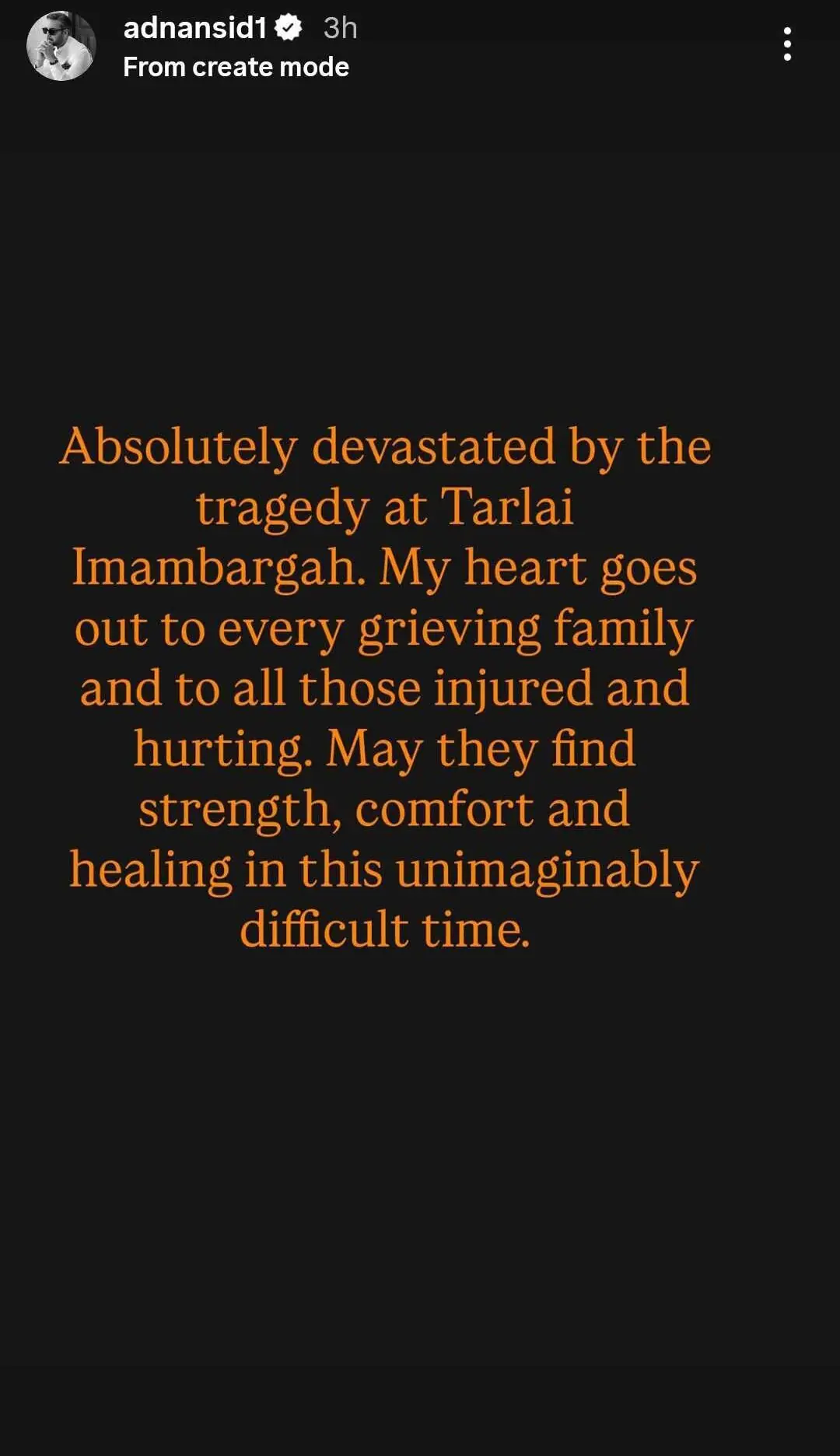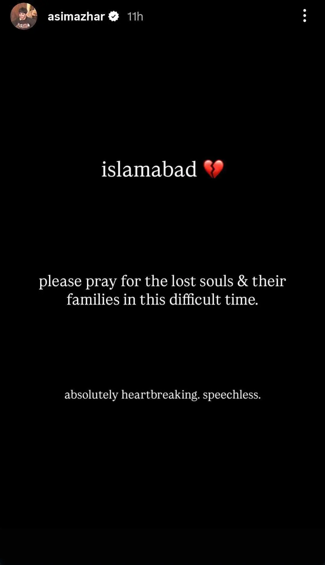 Actors Sheheryar Munawar and Adnan Siddiqui left messages of support. Munawar asked for God to have mercy while Siddiqui hoped the bereaved and injured could “find strength, comfort and healing in this unimaginably difficult time”.