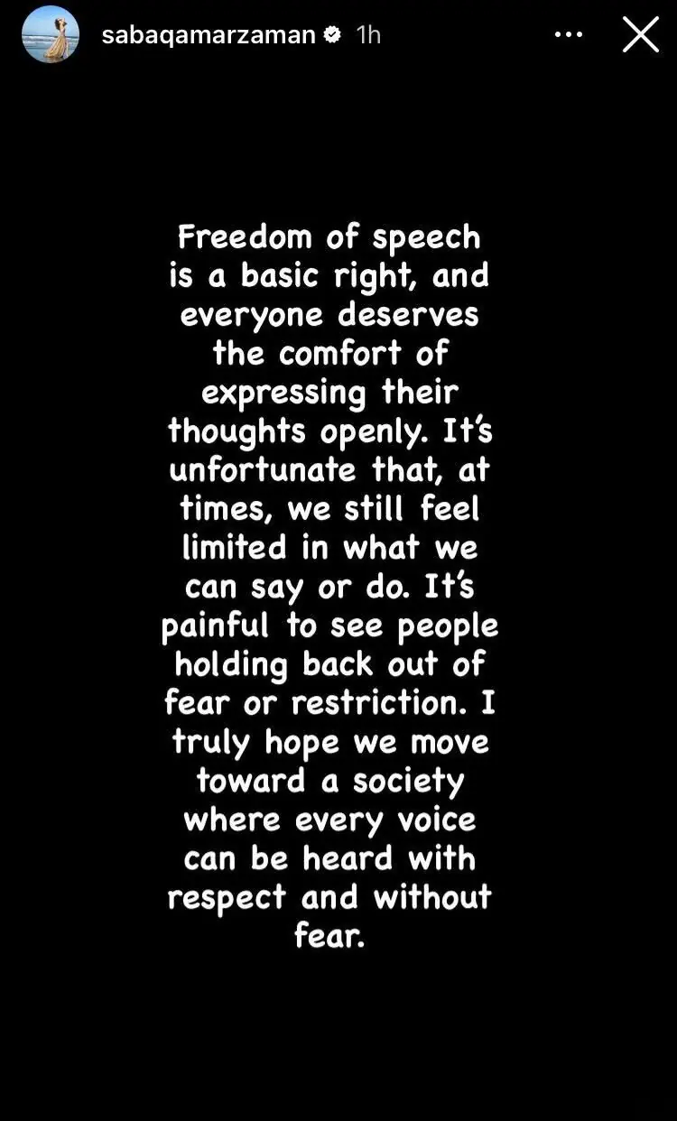 In a follow-up story, she said, “Freedom of speech is a basic right.” The Muamma star wrote, “everyone deserves the comfort of expressing their thoughts openly” and lamented seeing people “hold back out of fear or restriction”.