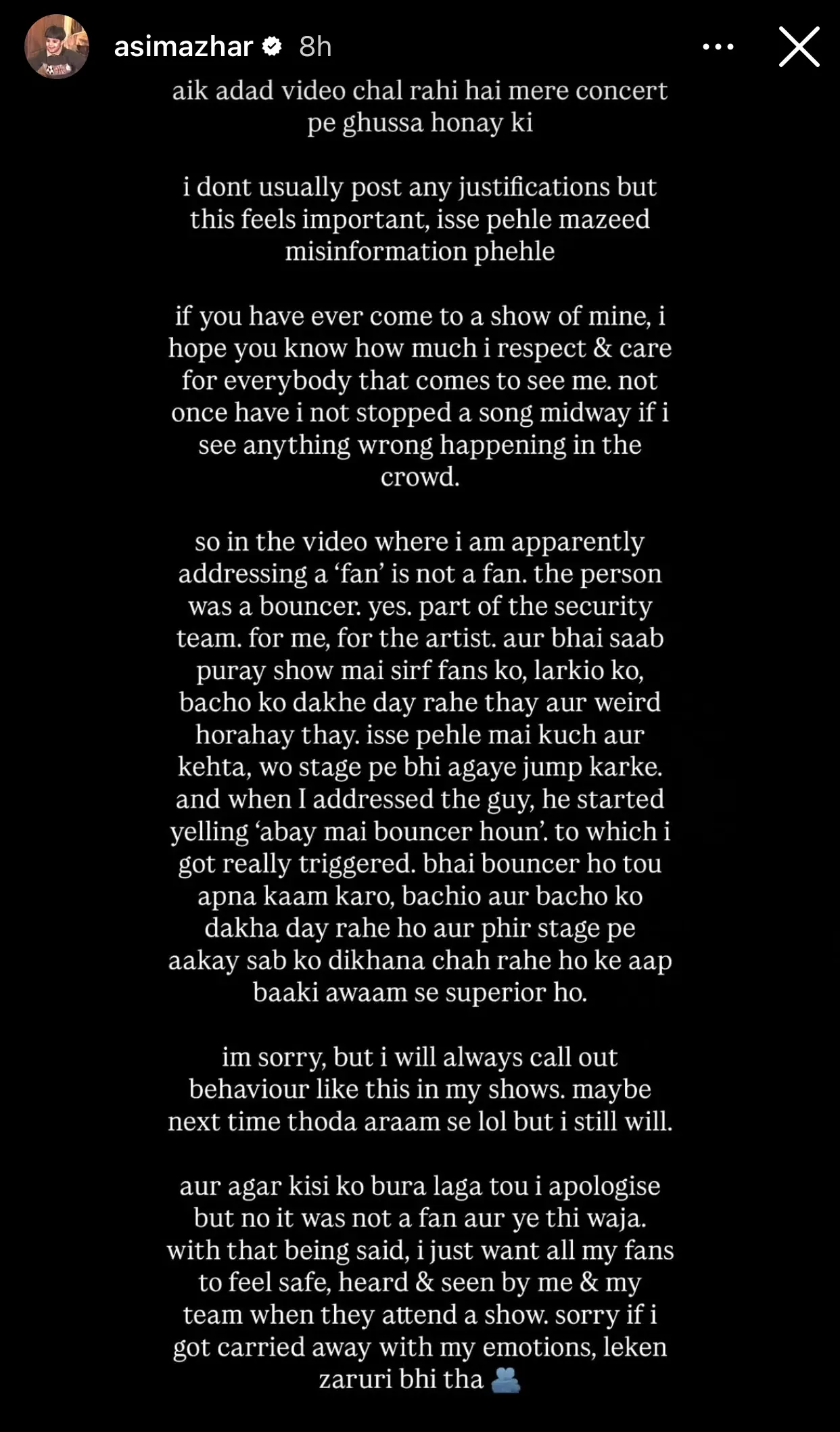 After a video of Asim Azhar appearing to lose his temper at a concert began making the rounds online, the singer took to Instagram early Wednesday to address it himself, before, as he put it, the narrative spiralled any further.