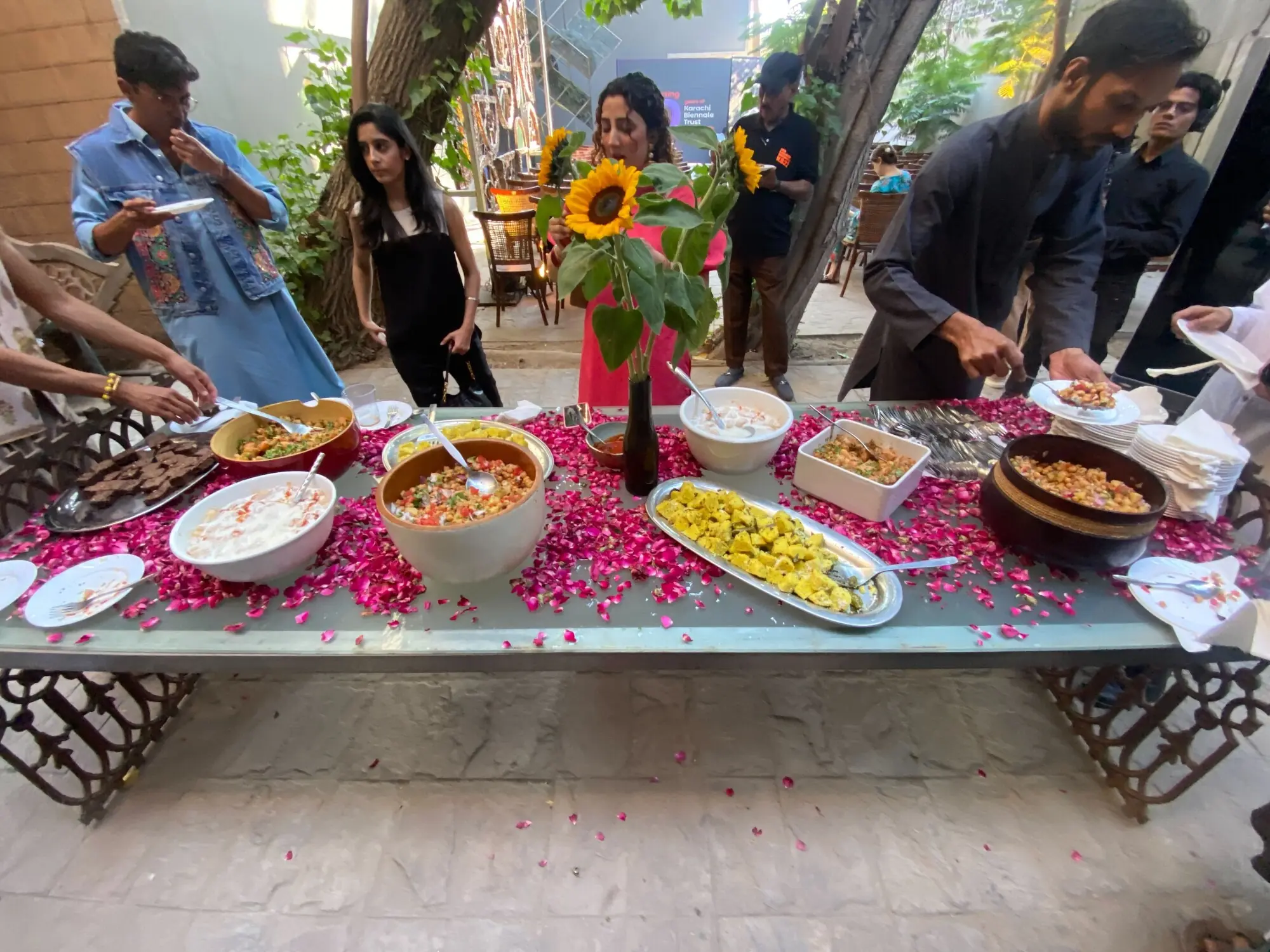 The loud, full laughter of artist Amin Gulgee and his friends travelled across the lawn before I even reached the seating area. Somewhere near the tablescape, Gulgee’s voice rang out — “Eat!” — enthusiastically directing every new arrival towards a beautifully curated spread of homemade dhoklas, khattay aloo and chaat, all served on a bed of rose petals.