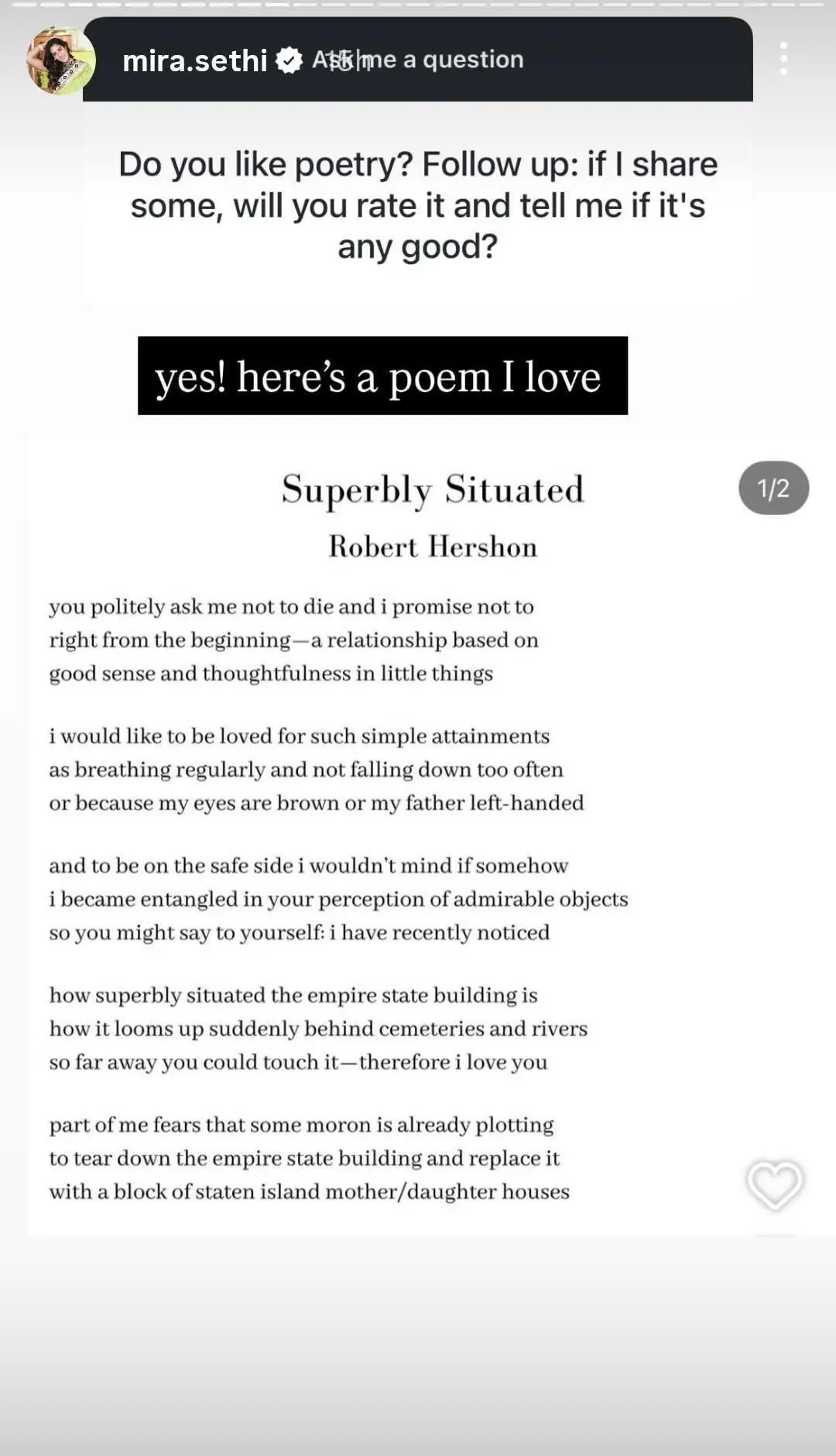 When asked about poetry and book recommendations, Sethi said she liked Robert Hershon’s Superbly Situated and recommended books written by Dr James Hollis.