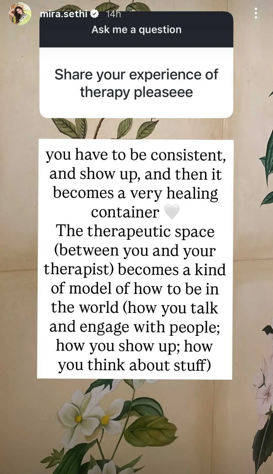 One of the more serious questions was one where a user asked Sethi about her experience with therapy. She called therapy a “healing container” and said the key to its success lay in consistency.