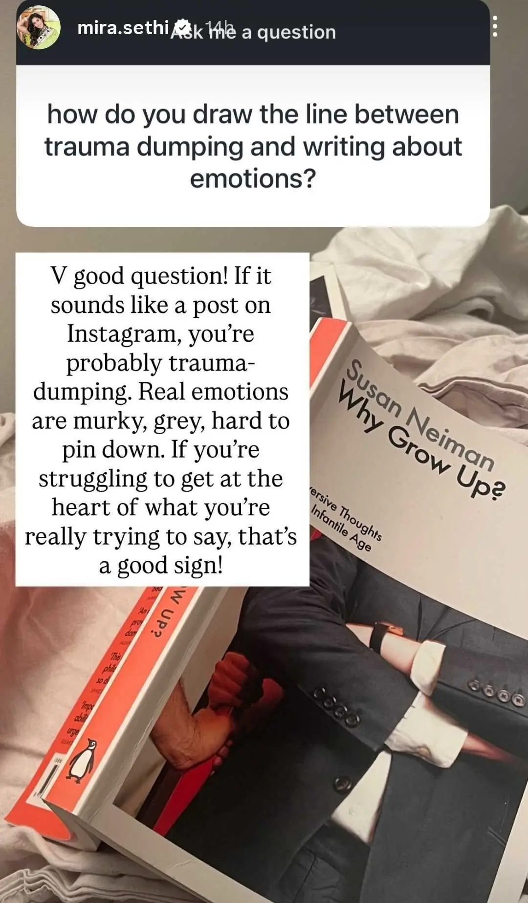 One fan asked how they could differentiate between writing about grief and trauma dumping, to which Sethi said, “If it sounds like a post on Instagram, you’re probably trauma dumping.” True emotions, she said, were murky and grey, so writing about them is supposed to be challenge.